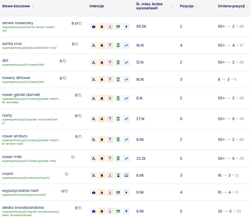 W ramach współpracy skupiono się zarówno na widoczności, jak i użyteczności serwisu. Rozbudowano strukturę o strony producentów włączone do głównej nawigacji, co pozwoliło przechwycić ruch na frazy brandowe. Równolegle wzmocniono kategorie ogólne (np. rowery damskie i męskie), poprawiając widoczność dla zapytań o dużym wolumenie.