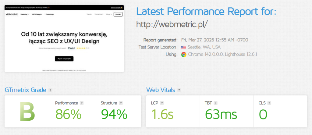 Analiza szybkości mobilnej w GTMetrix. Źródło: www.gtmetrix.com