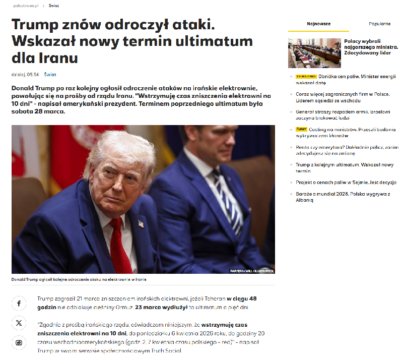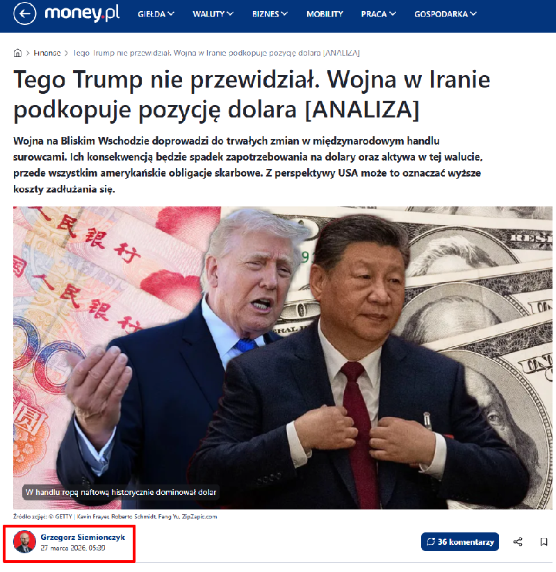 Artykuł na Money.pl znajdujący się w Google News z oznaczonym autorem. Źródło: www.money.pl/finanse/tego-trump-nie-przewidzial-wojna-w-iranie-podkopuje-pozycje-dolara-analiza-7268537391818880a.html