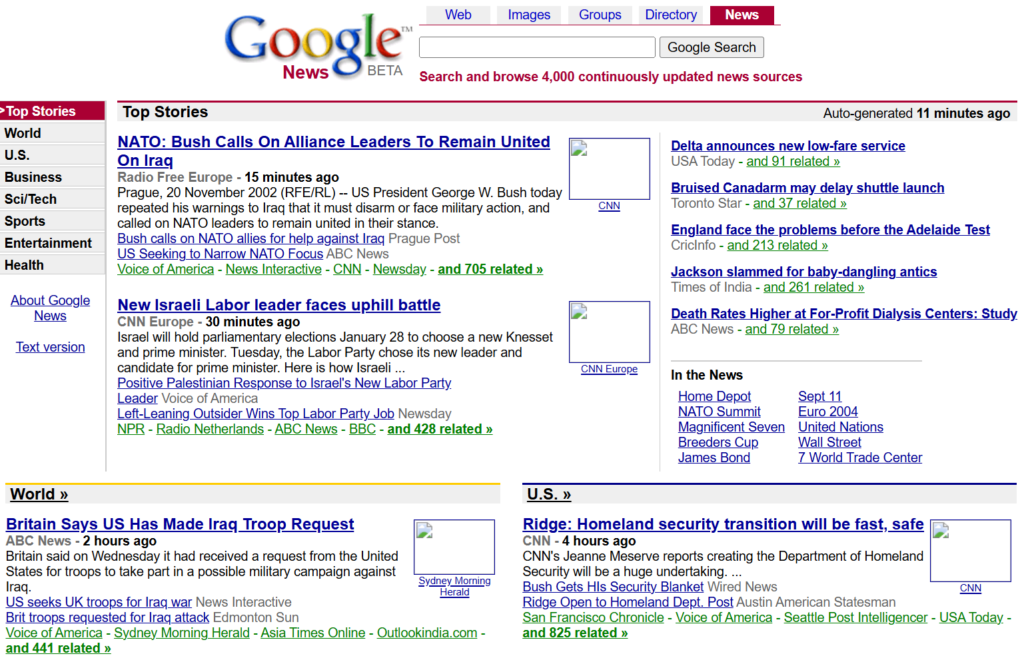 Wygląd portalu Google News w 2002 roku. Źródło: web.archive.org