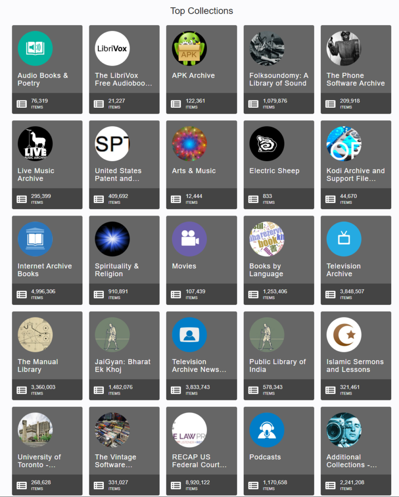 Kategorie możliwe do odtworzenia w Internet Archive. Źródło: archive.org