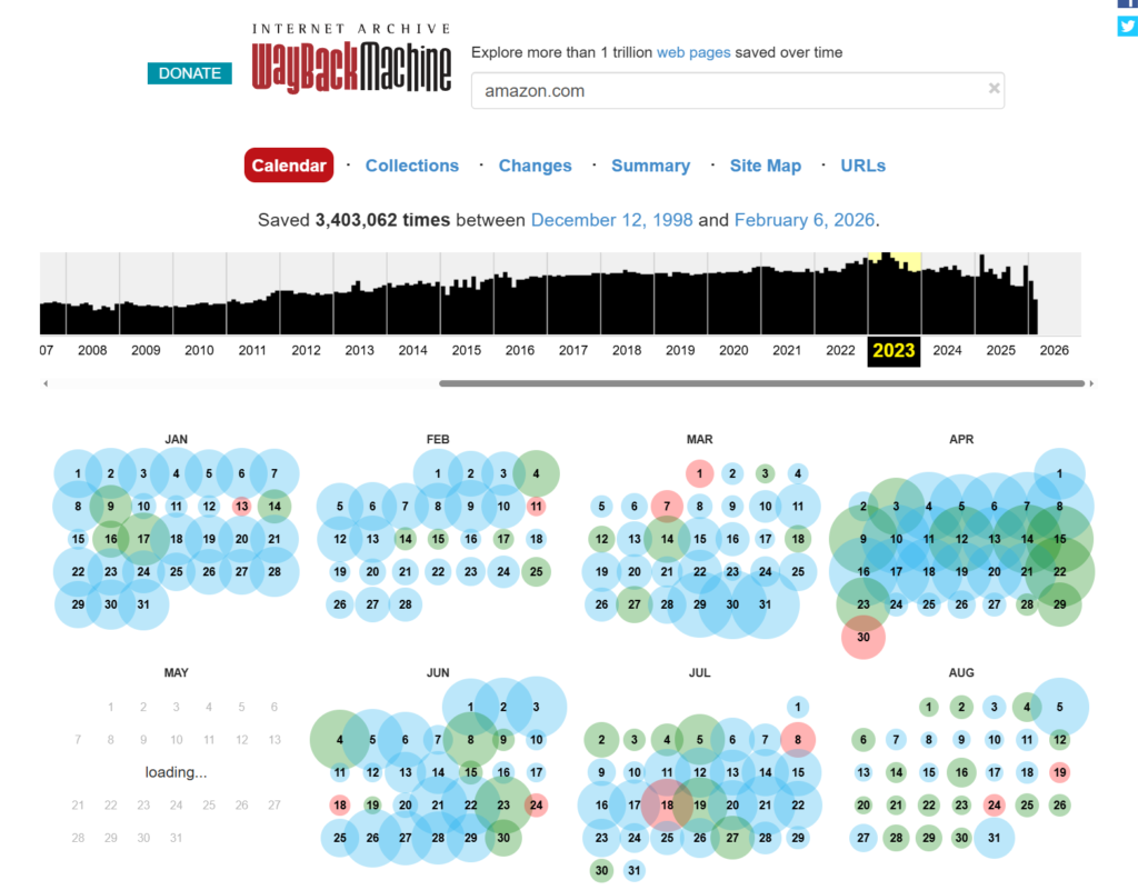 Gęsto rozmieszczone zapisy strony Amazon. Źródło: web.archive.org/web/20230615000000*/amazon.com