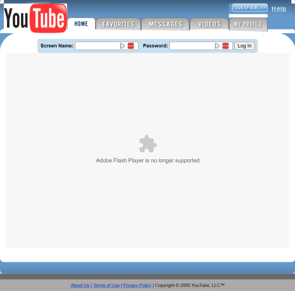 Pierwsza dostępna wersja YouTube z 5 maja 2005 roku. Źródło: web.archive.org/web/20050505071842/http://www.youtube.com/