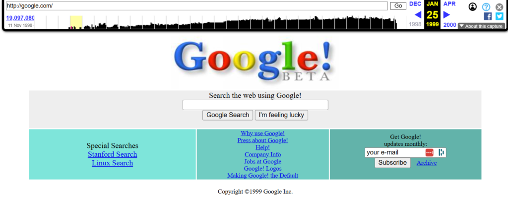 Wersja wyszukiwarki Google z 25 stycznia 1999 roku. Źródło: web.archive.org/web/19990125085933/http://google.com/