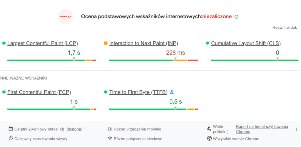 Analiza wskaźników Core Web Vitals w PageSpeed Insights.