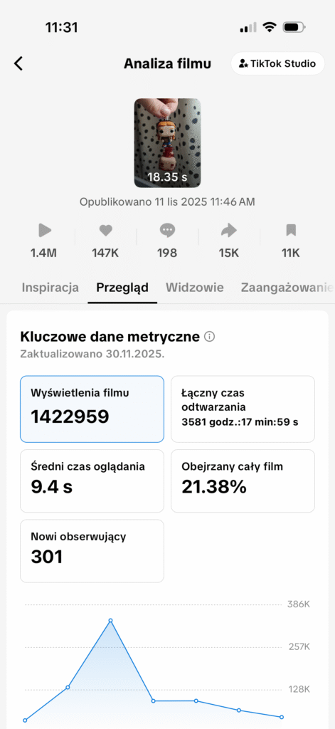 Najnowszy filmik, w którym kreatywnie demonstruję, jak za pomocą sznureczka można połączyć dwie figurki, osiągając na dzień 1.12.2025 imponujące 1,4 mln wyświetleń oraz 147,3 tysiące polubień, jest najlepszym dowodem na to, że nawet drobny, kreatywny wkład użytkownika utrzymuje zainteresowanie. Fakt, że ponad 11,8 tys osobób zapisały filmik, świadczy o tym, że treść jest postrzegana jako użyteczna i inspirująca, co algorytmy nagradzają najwyższymi zasięgami. Mój eksperyment trwa 4 tygodnie, a w tym czasie moje filmy otrzymały 240 tysięcy polubień – niewiarygodne.