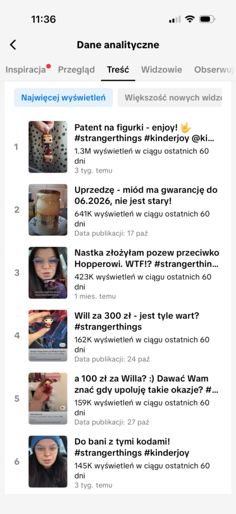 Moje zestawienie zasięgów z TikToka jest brutalną, ale merytoryczną konkluzją o naturze marketingu w mediach społecznościowych. Temat Kinder Joy i Stranger Things, o silnym ładunku emocjonalnym (kolekcjonowanie, frustracja, nostalgia), oparty na strategii FOMO, osiąga milionowe zasięgi. Natomiast rolka, w której informuję o udziale w Szlachetnej Paczce, ma zaledwie 373 wyświetlenia.