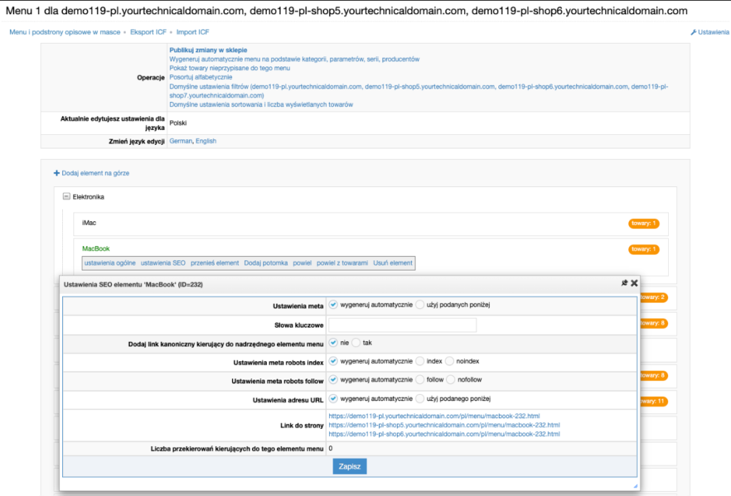 Sekcja SEO w IdoSell wyróżnia się szerokim zakresem ustawień treściowych.